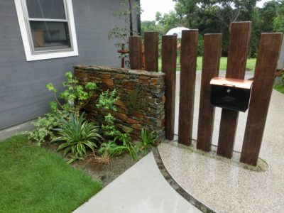 門柱的な白い大きな壁に、自然石を組み入れました! >>